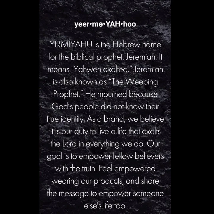 Yirmiyahu Apparel is a platform for all to share their own testimony. It does not have to be a testimony related to the clothing. We desire to be an avenue for people to exalt Yahweh, because He is our everything. “It is through him that we live and function and have our identity (Acts 17:28 TPT).” If our name means “YHWH EXLTD”, and we did nothing but “exalt” ourselves, we would be hypocrites.